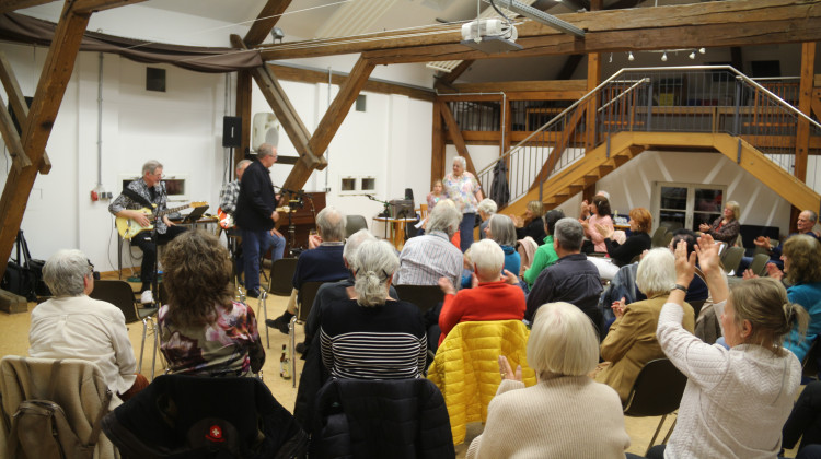 Foto: Gute Stimmung im Illenau-Atelier – rund 60 Gäste erlebten den Musikabend „Saiten-Blüten International" des AutorenNetzwerks Ortenau-Elsass® mit Combo2Go und Richard Metz. ©Andreas Peter Geng